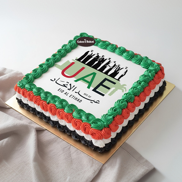 This delicious cake features a smooth cream finish, UAE flag–themed colored sides, and a patriotic edible photo on the top, making it the perfect centerpiece for your celebration.